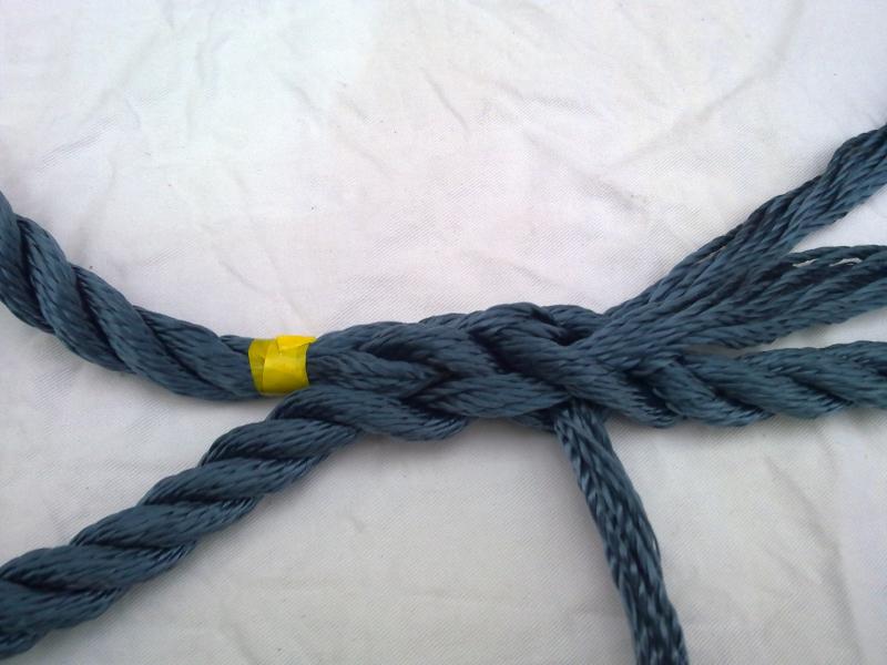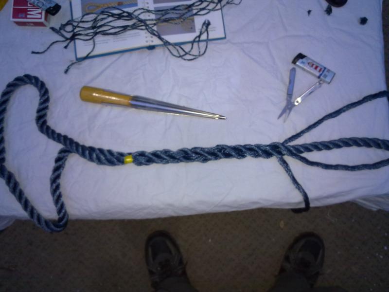 Als erstes muß das Ende aufgedröselt werden, ich mache das immer lieber etwas zu lang als zu kurz. Den Rest sichere ich gerne mit einem Stück Isoband oder Takelgarn. Wichtig jetzt: ich muß gegen den Schlag arbeiten und immer von mir weg. Das mittlere der aufgeschlagenen Kardeele also gegen den Schlag duchstecken ..... |