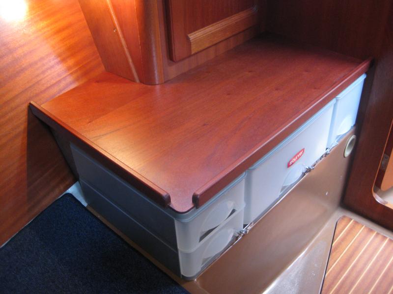 Mit 3 Curver-Schubladensystemen konnte dem Wunsch der Bordfrau nach mehr leicht zugänglichem Stauraum entsprochen werden. Oben drauf passt genau eine Metro-Box....