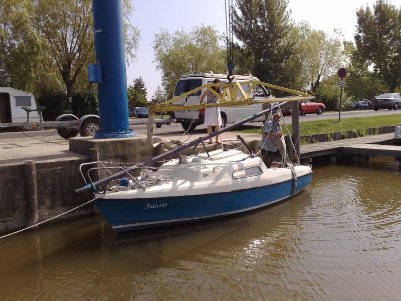 Auf dem Bild bin ich beim kranen. Der Trockenliegeplatz ist ca. 100 bis 200m (je nach Platz) hinter dem Kran, über abgesperrtes Gelände vollkommen eben und geteert zu transportieren. Ich hab das am Schluß einfach immer mit dem Panda zum Kran gezogen.