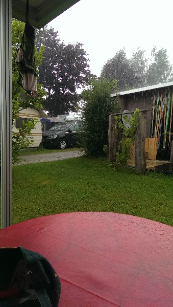 was ist schöner, als eine Planung, die ins Wasser fällt? Gestern war es so schwühl, es reichte nur für den Rasen. Wasser srömte schweistechnisch von innen nach aussen), danach lecker Essen, die wohl leckerste Haxn der Welt, zu zweit reicht eine (Rohgewicht 1,3 kg), dazu Schüssel mit Kraut, ummerer 9 Öken. Wo? Riegsee, eh kloar. Heute zieht grad eine Regenfront mit Gewitter durch. Also muss ich kein Boot putzen! sitze auf der neuen Veranda, davor pritschst wahnsinnig. Morgen, Sonntag, nix arbeiten, also auch nix Boot putzen. Einzig der Datenempfang ist hier "Edge", kann weder Internet noch gscheit Telefonieren. Mail entwerfen geht, das reicht. (Und die schicke ich heute Nacht mit Bildern durch) Dafür Natur pur. Schönen Sonntag LG Schorsch