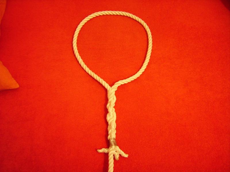 ![]() ![]() ![]() Als erstes muß das Ende aufgedröselt werden, ich mache das immer lieber etwas zu lang als zu kurz. Den Rest sichere ich gerne mit einem Stück Isoband oder Takelgarn. Wichtig jetzt: ich muß gegen den Schlag arbeiten und immer von mir weg. Das mittlere der aufgeschlagenen Kardeele also gegen den Schlag duchstecken .....