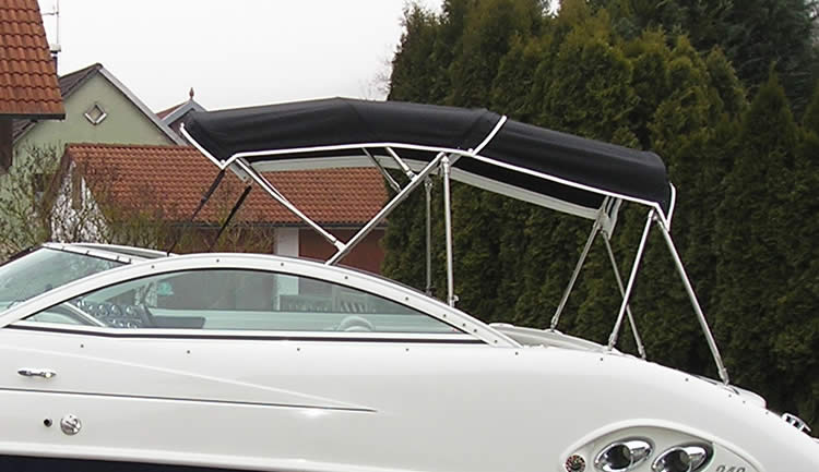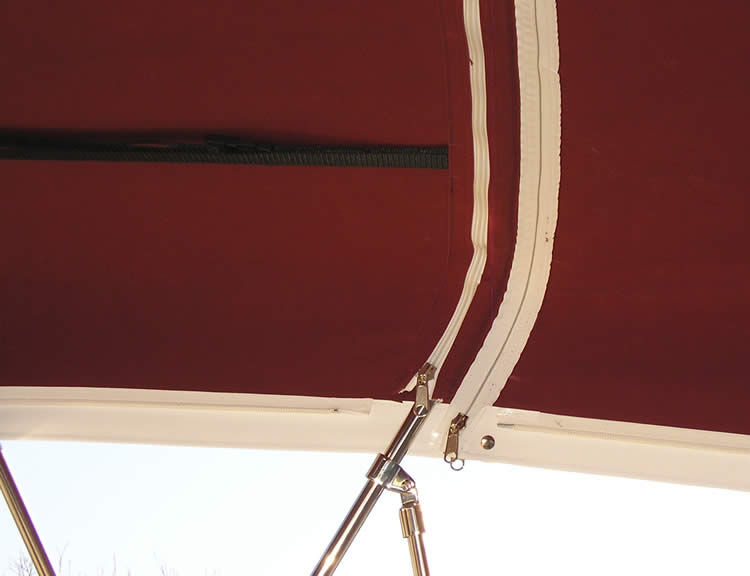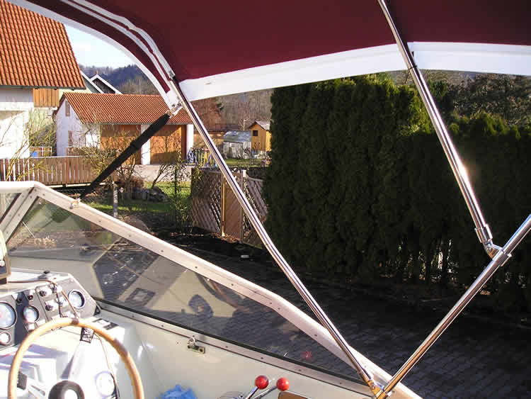 es gibt 2 Arten von Reißverschlußtaschen für die Gestängebügel bei uns - einmal die, mehr oder weniger über den kompletten Gestängebogen laufen bis zur Verstärkung (kannst du jetzt auch auf den Bildern sehen, was ich vorhin gemeint habe) - einmal wesentlich kürzere, die hauptsächlich beim vierten und hinteren Gestängebügel eingesetzt werden Das Bild zeigt dir das Bimini von innen und zwar den Hauptbügel. Das ist eine lange Tasche, da ja der Stoff von hinten nach vorne einen Halt bekommen muss. Diese Tasche ist auch relativ einfach zu machen, weil sie nur den Stoff nach hinten weg gleichmäßig spannen muss. Dort sind auch zwei Durchbrüche drin für die Gurte des ersten Auslegers vom Bimini. Gurte deswegen, weil sie sich wesentlich genauer einstellen lassen als Taschen und dieser Ausleger die Spannung fürs Bimini gibt. Und sollte irgendwann mal im Laufe der Jahre der Stoff ein bisschen länger werden, kann man damit problemlos nachspannen, bei genähten Taschen geht das nicht.