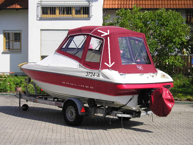 im normalen Verdeckhinterteil, das nicht komplett wegnehmbar ist, geht dann der Zug vom hinteren Oberteil über das Rohr bzw. die Naht direkt nach unten auf die Tenax im Eck. D.h. ich kann bei der Montage etwaige Ungenauigkeiten besser ausbügeln, je nachdem wie stark ich den Stoff spanne. Geht bis zu einem gewissen Grad, wenn es nicht mehr geht, ist es auch nicht schlimm, dann macht man eben die Naht nochmal schnell auf und bessert nach. Der hintere Gestängebügel sitzt in einer flach aufgenähten Tasche ungefähr in Festerbreite.