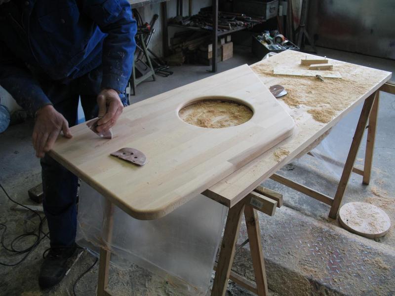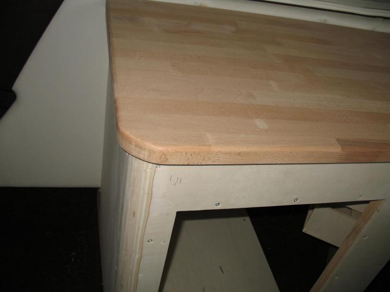 Arbeitsplatte der Küchenkontur angepasst, alle Rundungen gefräst und Ausschnitt für Spüle gemacht. An Ausschnitt Rundungen gefräst und von Unterseite gefräst.... Spüle von unten mit Silikon eingeklebt...