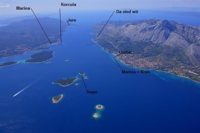 Hier noch ein schönes Bild. Rechts ist Orebic, links ist Korcula.
